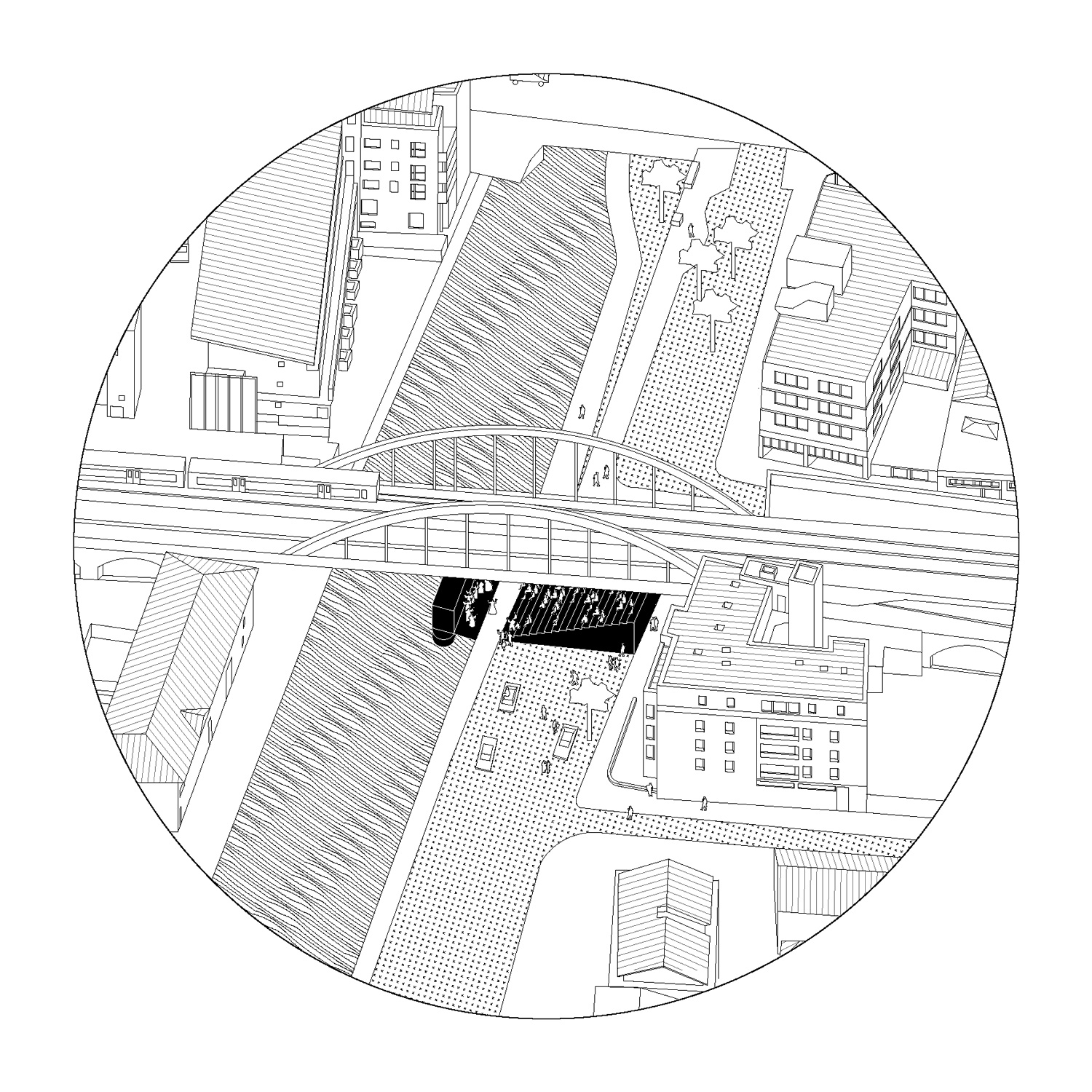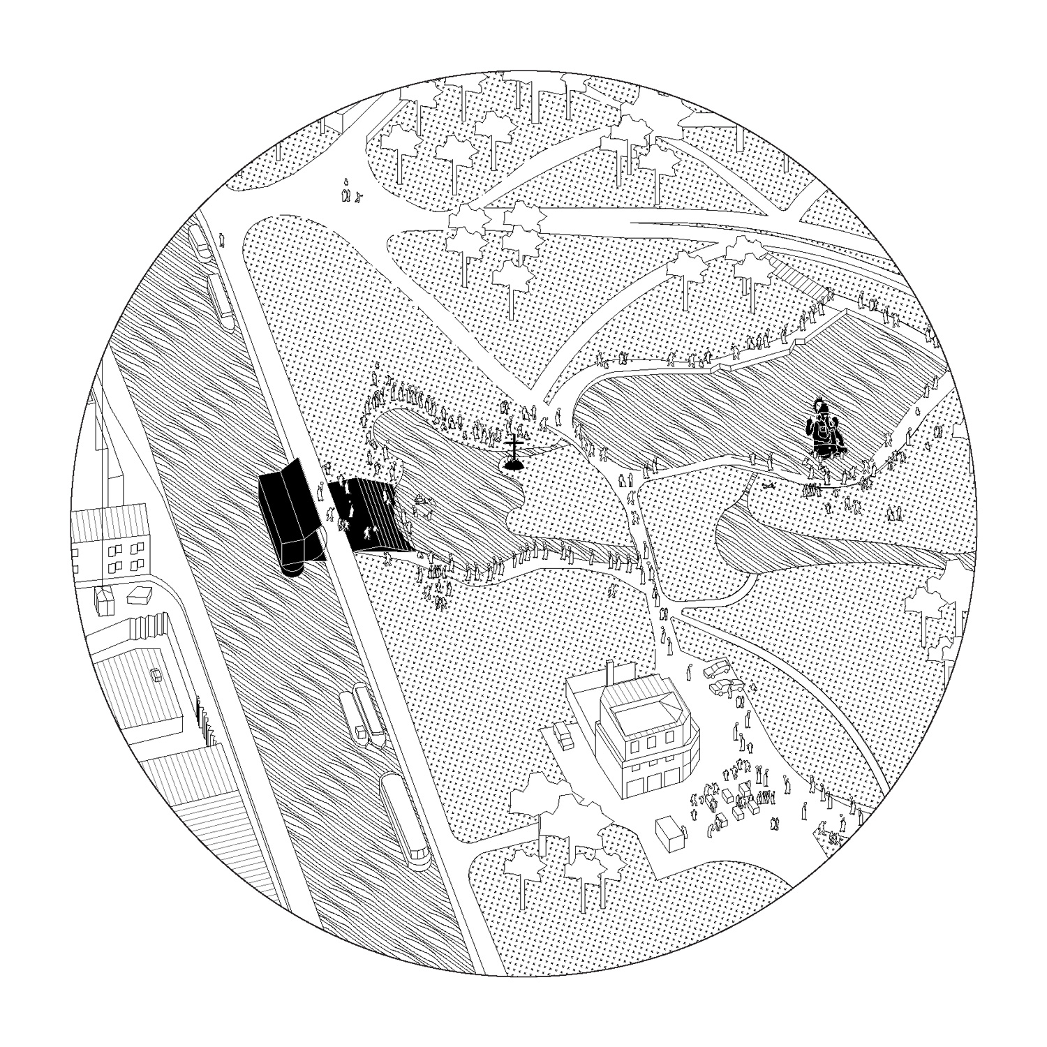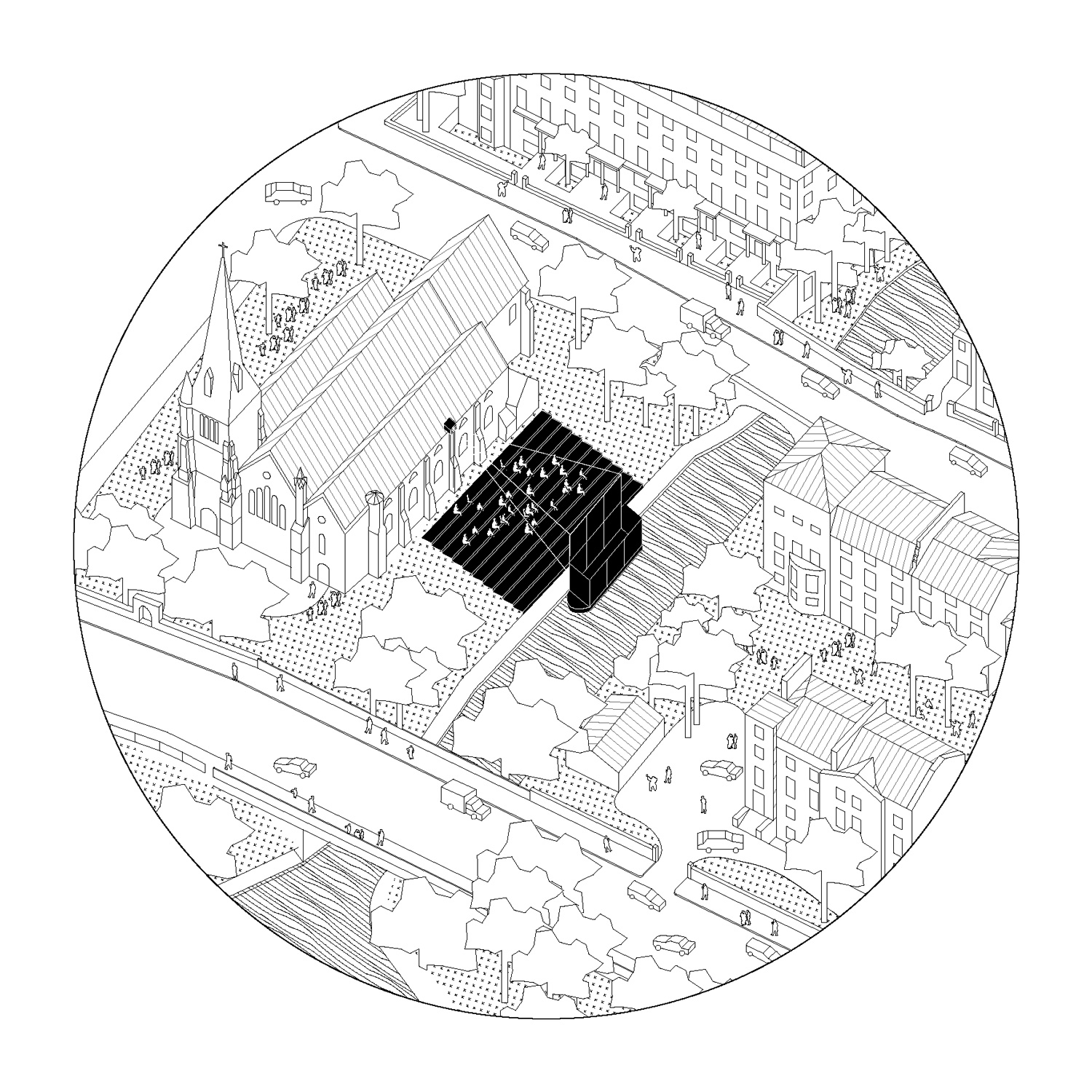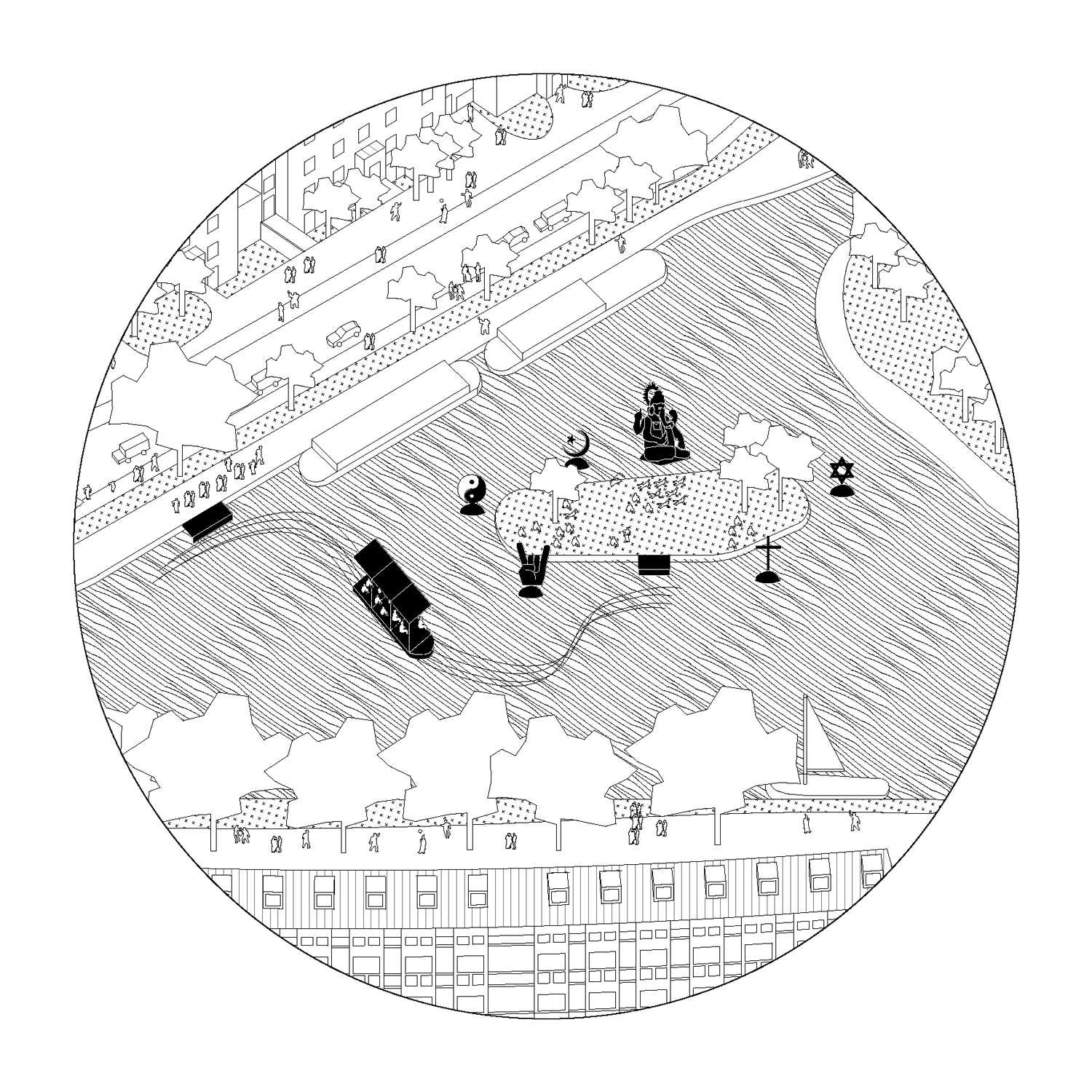 Generating a new mesh of public spaces ensuring homogeneous distribution of religions in the city. Operated by urban exploration along the navigable waterway, the purpose is to collect data about public areas of the urban landscape which are abandoned all or part time, with the intention of accessing and using them. One-off low-cost interventions bring new ways of use: bleachers, viewpoints/gazebos, pathways, pontoons… It is a plan that evolves in time, indifferently adapting itself to the “already-there”, in order to reveal their intrinsic condition. A walk that highlights the possible situations, questions of fact and potential speculations, making religion public by placing it in a space shared by all. This thinking process captures the programme as a pretext for a new plan of action that could apply to other uses: cultural, sporting, educational purposes… and activate other natural or artificial infrastructures within the city.